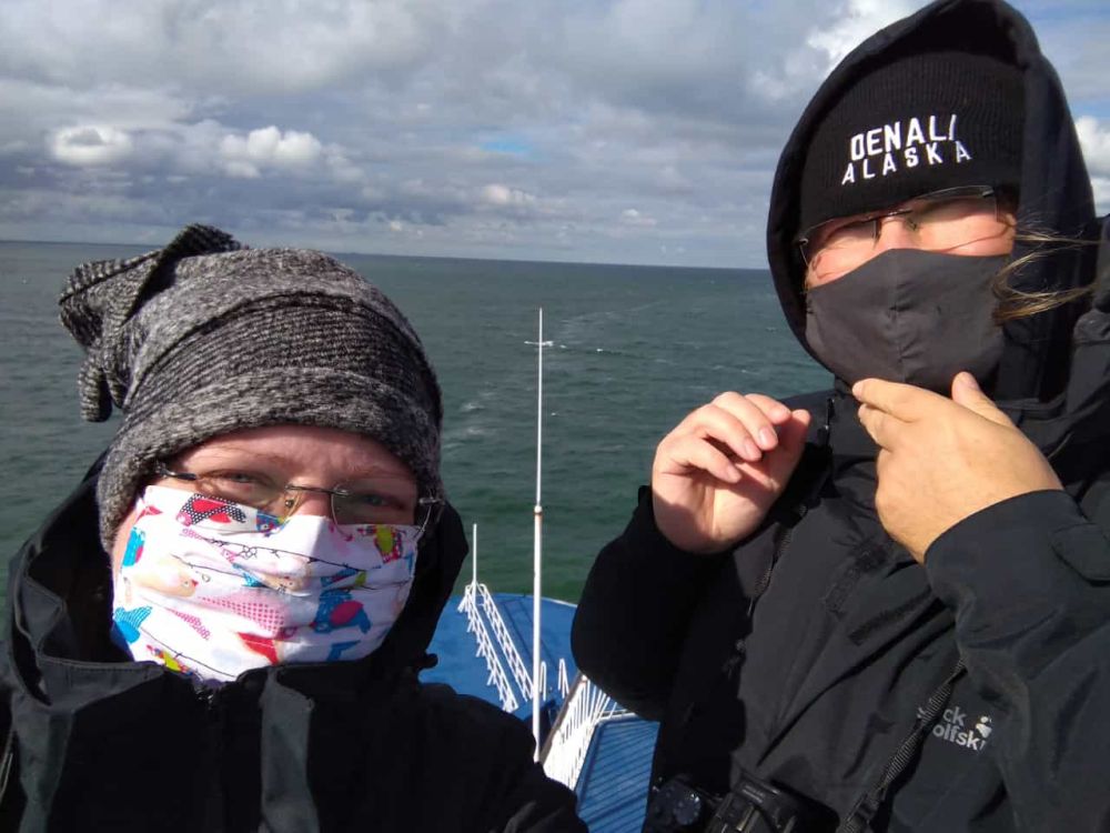 Heute machen wir einfach mal nix, außer schlafen, essen, lustige Maskenfotos beim Essen knipsen, lesen, aufs Meer schauen, auf die Shetland-Inseln warten, hektisch die Shetland-Inseln knipsen, wieder schlafen, lesen und Baileys (Bärbel) und Cola (Rudi) trinken. Die Pause gefällt uns gut und ist eine gute Einstimmung auf die Quarantäne in Island. Ach ja, der erste Corona-Test in Hirtshals war für das komplette Schiff negativ. Damit ist die erste Hürde schon mal genommen und es schippert sich gleich ein bisschen ruhiger übers Meer.