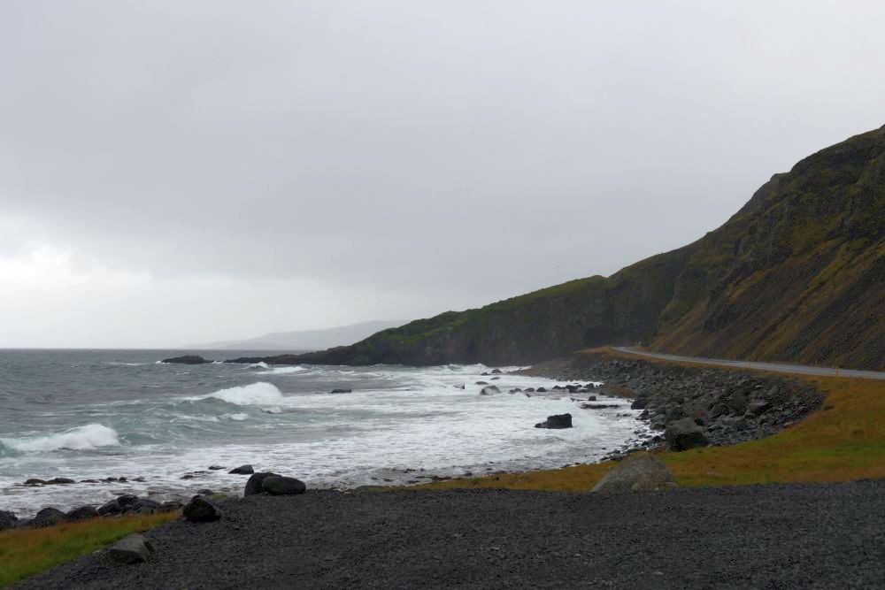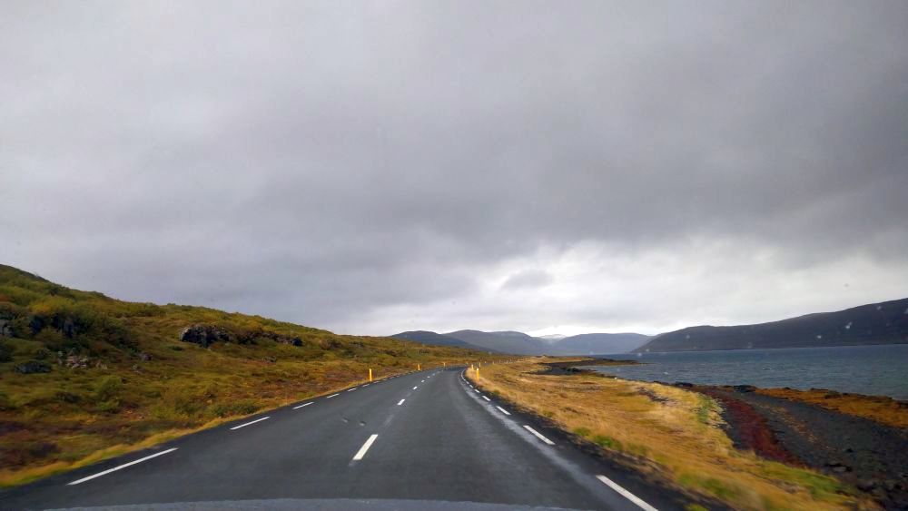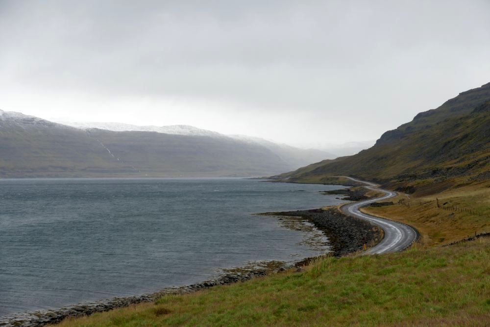 Und weiter geht’s – immer schön rein ins Fjord und wieder raus. Der Regen hält sich in Grenzen und nur auf der Westseite der Fjorde windet es ordentlich. Es ist kaum Verkehr und die Stimmung ist unwirtlich und auch unwirklich.
