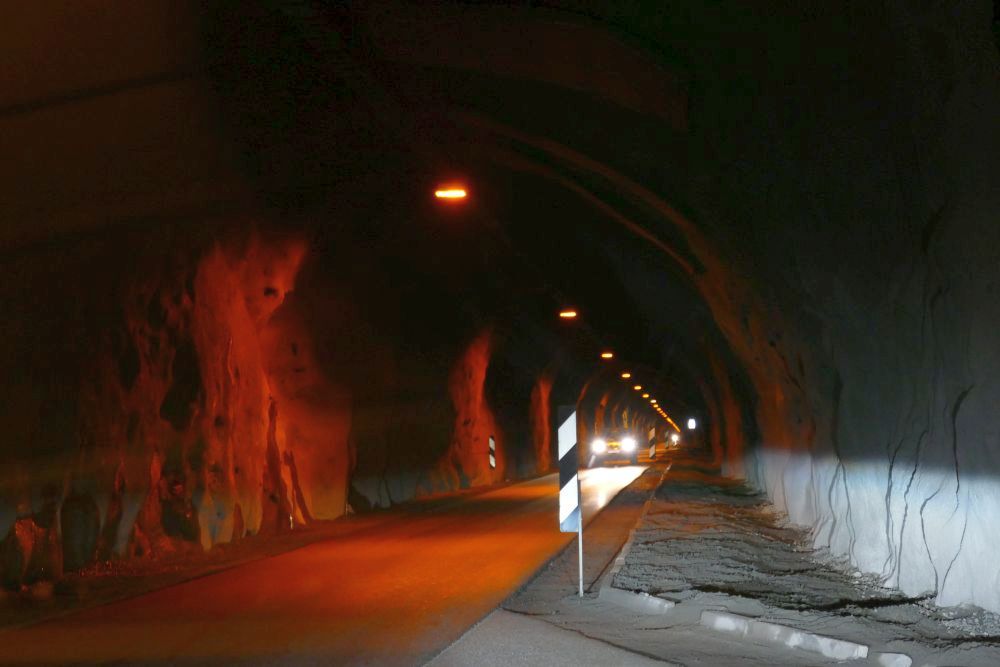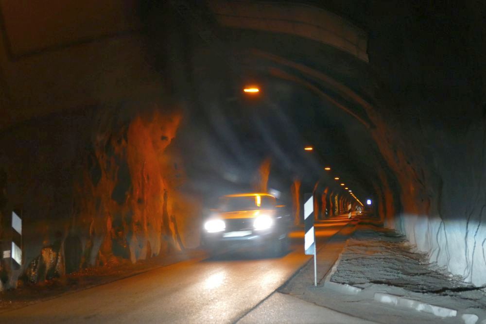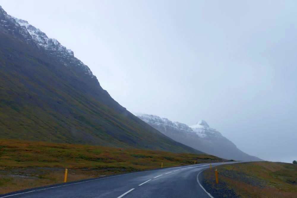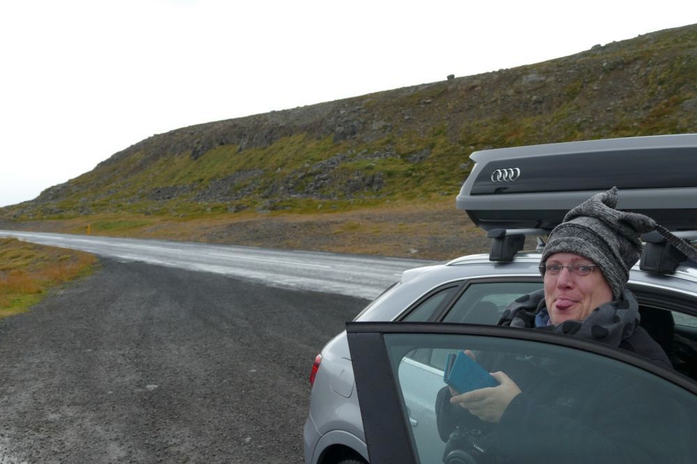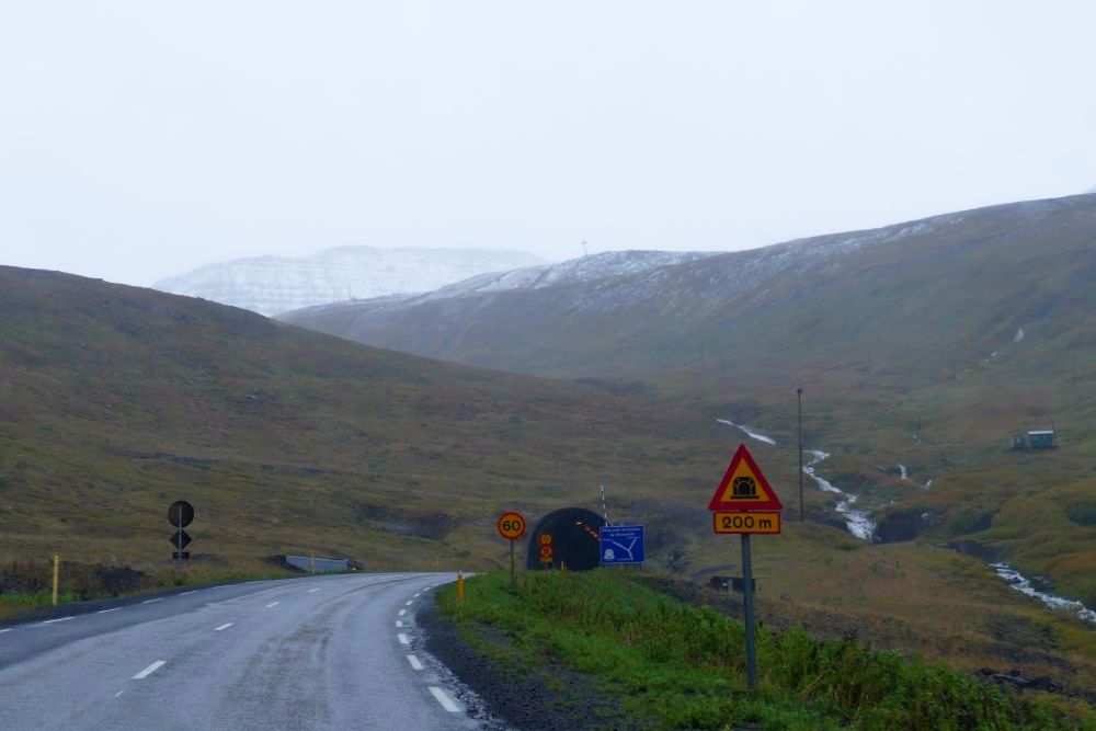 Danach wir es aber nochmal interessant, denn hinter Isarfjördur geht es in den Tunnel. Der ist auch am Anfang angenehm zweispurig, bevor er sich gabelt und jeweils einspurig in verschiedene Täler führt. Ist schon ein bissl schräg, vor allem, wenn dann von vorn doch erstaunlich viele Autos kommen – Freitagnachmittag halt – und man auf der Ausweichspur ist und Buchten-im-Fels-haschen spielt. Ich fand es lustig, Rudi war ein bisschen angespannt.